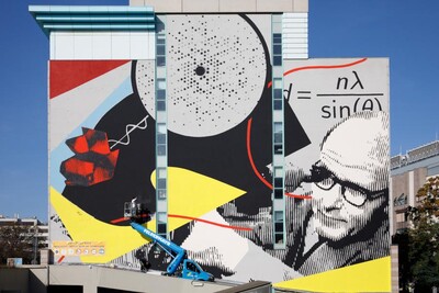 On the facade of the Max Perutz Labs the artist duo Käthe Schönle and Sebastian Schager, in collaboration with the art & science project ‘WIENERWISSEN’, created a large mural picturing the Austrian-British Nobel Prize winner Max Perutz.
