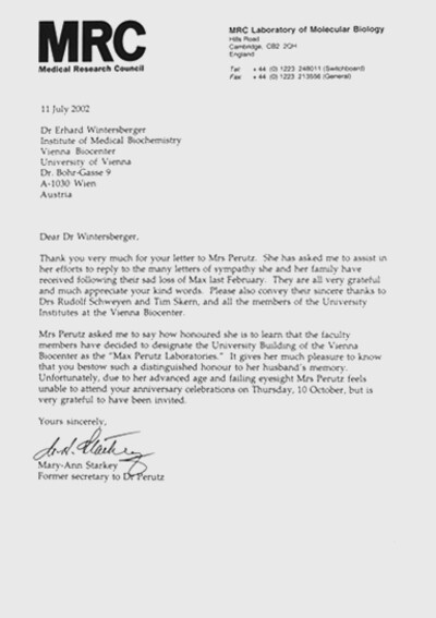 Gisela Perutz, Max's Widow, grants permission to name the new research institute after her late husband.