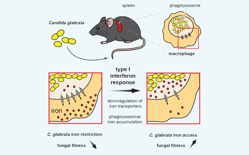The group led by Karl Kuchler and lead author Michael Riedelberger now show that the host immune response by the so-called type I interferons dysregulate the host iron metabolism upon infections by Candida glabrata. Interferons are immune signaling molecules which control microbial and fungal infections. However, infections by Candida glabrata set-off interferons that disrupt normal expression of iron transport proteins in macrophages. Therefore, iron inadvertently accumulates within phagolysosomes of macrophages, thereby facilitating iron scavenging by the pathogen. Consequently, Candida glabrata can exploit phagolysosomal iron pools, thus promoting fungal replication and survival from immune defenses. A single macrophage can engulf up to 50 fungal cells, which can survive within this immune cell for months. Of note, physical damage of infected macrophages can further promote the dissemination of Candida glabrata within the host and therefore enhances the fungal dissemination.
