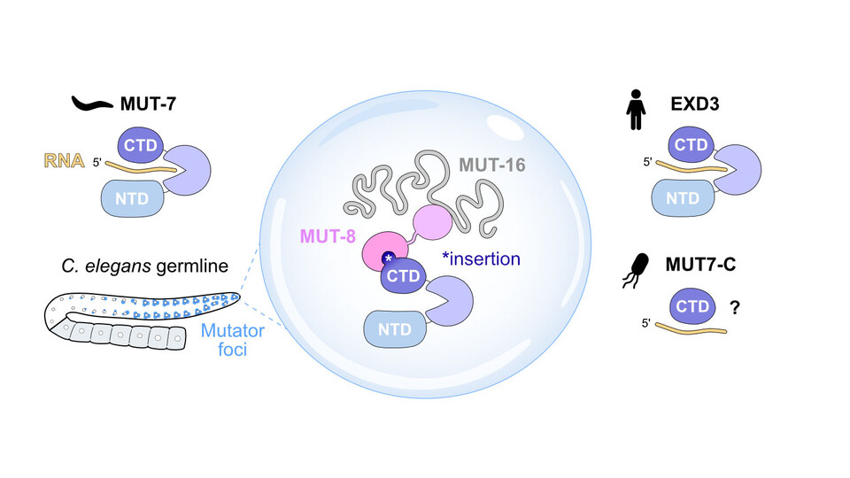 Transposable elements, DNA sequences that can move within the genome, pose a significant threat to genome integrity and, consequently, to an organism's viability, particularly when active in the germline. RNA interference (RNAi) pathways, which use small RNAs to silence genes during or after transcription, are a key defense mechanism against these elements. The exoribonuclease MUT-7 is essential for the generation of small RNAs in the germline. While MUT-7 is conserved across species, its function was previously understood only in in flies. Sebastian Falk and his team have discovered that the C-terminal domain of MUT7 (MUT7-C) exists as an individual protein in prokaryotes and has acquired an insertion in animals, thereby expanding its functionality.