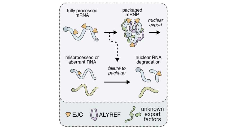 The export of messenger RNA (mRNA), which takes the blueprint for building proteins from the cell’s nucleus to the surrounding cytoplasm, is an essential step in the expression of genes in complex organisms such as animals or plants. This process requires that only mature and healthy mRNAs are exported, while other RNAs are degraded in the nucleus. Scientists think that export factors are behind this selectivity by packaging mature mRNA, which protects it from nuclear degradation. However, this is currently only a model of the process and lacks detail.