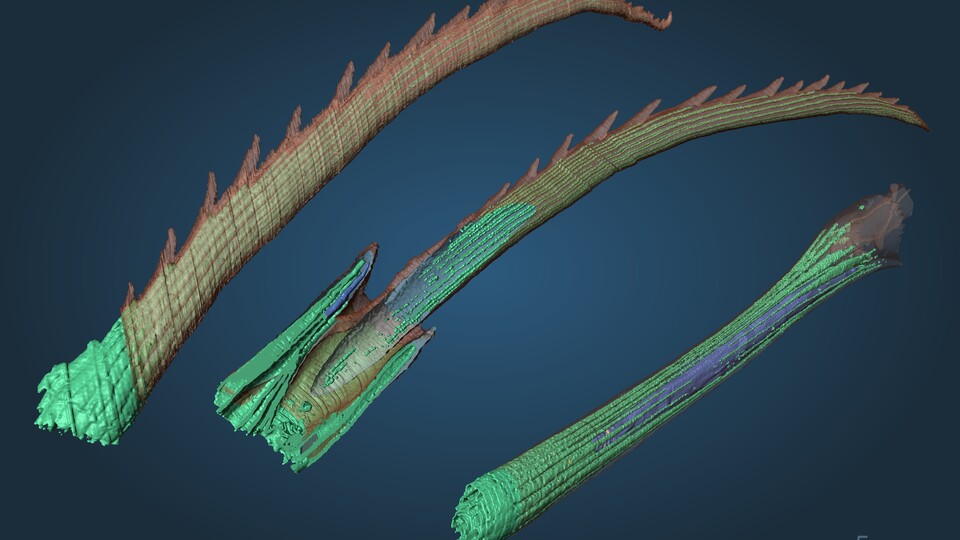 These dynamic processes operate on a material jetting principle. Florian elaborates: "Our analysis indicates that bristles are not cast, but chitin is ejected by the chaetoblasts. The microvilli of the cells play a crucial role in shaping the distinct geometric structure.” Bristle biosynthesis usually takes place in two days and gives rise to different shapes, depending on the developmental stage of the worm. Starting with the production of the bristle tip, followed by the middle section, and finally the base, the process resembles 3D printing, where an object is generated layer by layer.