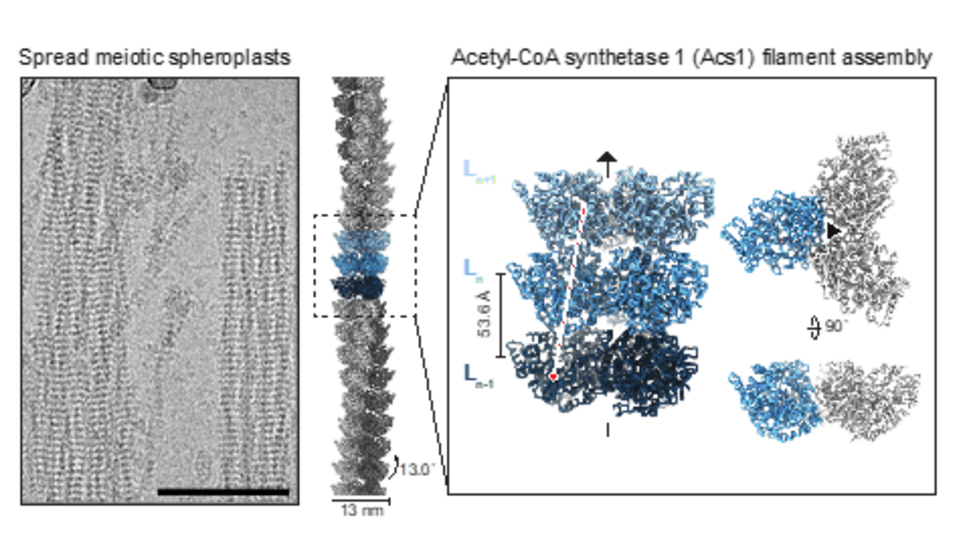 Whereas mitochondrial filaments are composed of the conserved aldehyde dehydrogenase 4 (Ald4), the nuclear and cytoplasmic filaments are composed of acetyl-CoA-synthetase 1 (Acs1). Acs1 generates acetyl-CoA, a key metabolic intermediate that links glycolysis with the citric acid cycle. In yeast, acetyl-CoA is also crucial for histone acetylation, a process that regulates DNA packaging and gene expression. Acetyl-CoA synthesis involves a two-step reaction using ATP as the energy source. Joao explains, "Our experiments indicate the presence of acetyl-AMP bound to filamentous Acs1. This suggests that the enzyme completes the first step of the reaction but cannot proceed to the second." He adds, "Acs1 expends energy to form a reaction intermediate, but structural constraints prevent it from completing the process. We propose that Acs1 produces acetyl-CoA at the onset of meiosis, then inhibits itself by forming filaments. Acs1 filaments are then inherited by spores. Filament disassembly is then used to generate acetyl-CoA without the need for ATP, enabling quick re-entry into cell proliferation.”