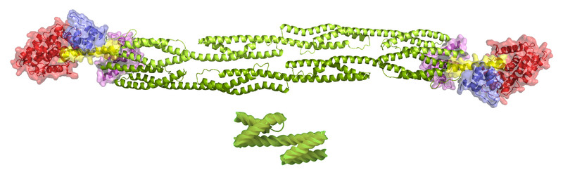 The structure showed that α-actinin forms a symmetrical complex made of two molecules. Each molecule has a head, short neck region and a rod-shaped body that looks like four fusilli pasta aligned in a zigzag. The head of α-actinin binds actin whilst two small L-shaped parts sit at the end of the rod and interact with the neck of the other molecule. However, the structure revealed to be more than the sum of its parts: placing two diametrically opposing α-actinin molecules does not only allow simultaneous binding of actin and titin filaments and so anchoring them in the Z-disc, but also confers regulation.