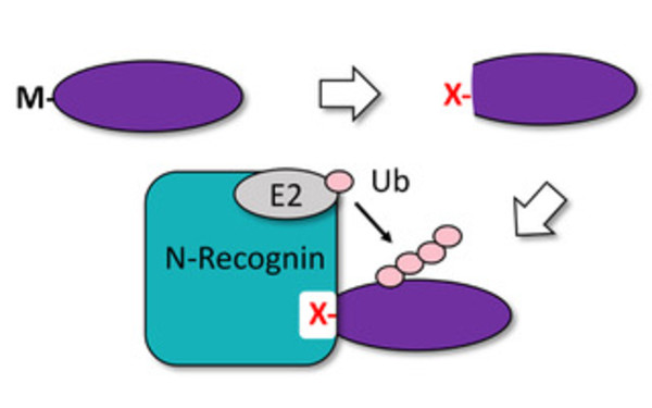 The amino terminus of a protein is frequently modified, e.g. by addition of acetyl groups, or by proteolytic cleavage to generate the mature protein, or a protein variant. So-called N-recognins bind to amino termini to influence the protein half life. We are interested in N-recognins for amino-terminal Leu in plants. We identified mutants that stabilize a model protein with Leu amino terminus. Mutated genes are investigated to understand the biological significance of this protein degradation pathway.