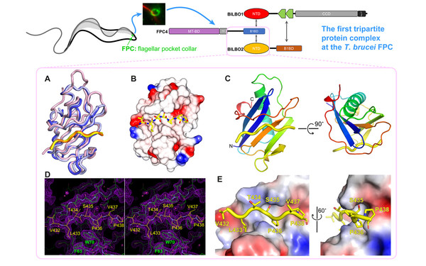 As the sole site for all endo- and exocytosis in trypanosomes, the flagellar pocket (FP) is essential throughout the life cycle of the parasite.The FP is maintained by the flagellar pocket collar (FPC), which is a condensed cytoskeletal structure around the FP neck and essential for both FP biogenesis and cytokinesis. We recently identified the tripartite interaction among three FPC components (BILBO1, BILBO2 & FPC4) and furhter characterized the atomic details of the interaction between BILBO2 and FPC4. (Isch*, Majneri* et al. 2021, PLoS Pathog.).