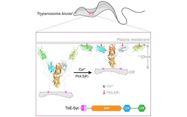 E-Syts exist in many eukaryotes including yeasts, plants, and animals. They localize at the membrane contact sites between the ER and the plasma membrane to mediate inter-membrane lipid transfer. We have recently characterized a unique E-Syt from Trypanosoma brucei, which is distinct from all known E-Syts in several aspects. We propose a working model for how TbE-Syt tethers the ER membrane to the plasma membrane in T. brucei (Stepinac et al. 2021, iScience).