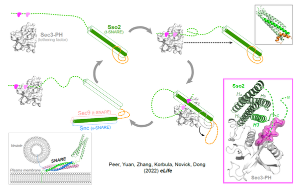 The final step of exocytosis in budding yeast involves the assembly of two t-SNAREs, Sso1/2 and Sec9, with the v-SNARE Snc1/2. The rate-limiting step in this process is the initial formation of a binary complex of the two t-SNAREs. We just reported a new crystal structure of the pleckstrin homology (PH) domain of Sec3 (a component of the exocyt tethering complex) in complex with Sso2, which reveals a novel dual-site interaction between Sso2 and Sec3 that plays an essential role in promoting the fusion of secretory vesicles with the plasma membrane. (Peer et al. 2022, eLife).