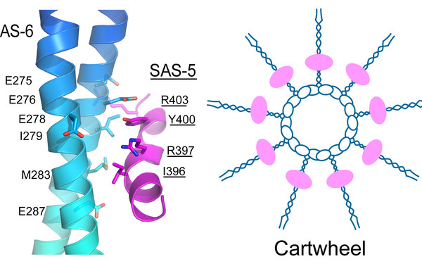 Centrioles play essential roles in both centrosome formation and cilium biogenesis. We have carried out structural studies on SAS-5 and SAS-6, two of the five core centriolar proteins. Our work uncovers the specific interaction between them and suggests a mechanism for them to cooperatively facilitate the correct assembly of the 9-fold symmetric centriole (Qiao et al. 2012, EMBO J.).