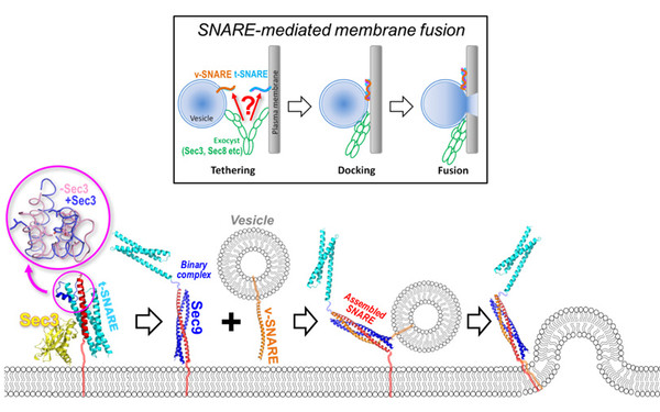 We have reported the crystal structure of the t-SNARE Sso2 in complex with Sec3, a component of the exocyst complex that serves as a vesicle tether at the plasma membrane. Our work provides a mechanistic explanation for the initial step of vesicle fusion (Yue*, Zhang* et al. 2017, Nat. Commun.).