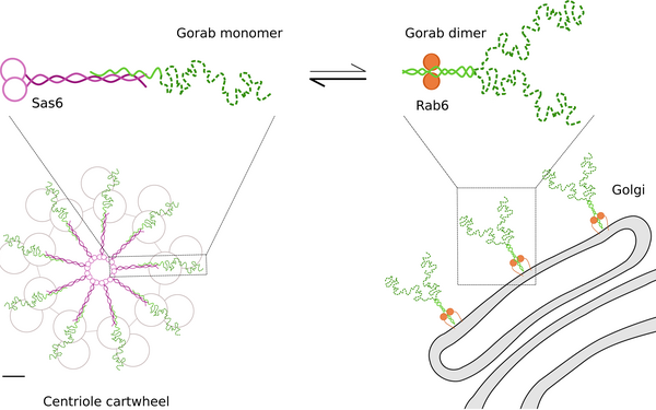 Gorab is a well-known golgin at the trans-Golgi network. Interestingly, we found that it also localizes at the centriole to facilitate the assembly of the 9-fold symmetrical cartwheel of the centriole. Our studies reveal that Gorab dimers at the Golgi exist in equilibrium with Sas-6 associated Gorab monomers at the centriole to balance its dual role. (Fatalska*, Stepinac* et al. 2021, eLife).