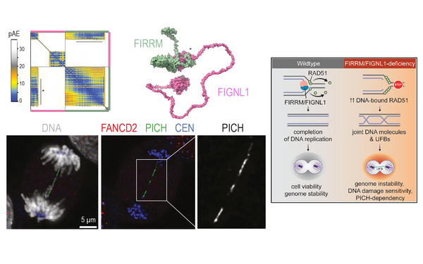 We are happy with a small contribution to a very nice study by Colin Stok, Marcel van Vugt, and colleagues. The authors identified factors that become essential for viability in the absence of PICH (which processes anaphase DNA bridges). Among the 10 hits, there was 1 protein of unknown function that turns out to interact with FIGNL1 and RAD51 at replication forks. Alphafold predicted a very stable complex between FIGNL1 and FIRRM (check the pAE plot). Read the study here: [Stok et al., Cell Reports, 2023, https://doi.org/10.1016/j.celrep.2023.112668]