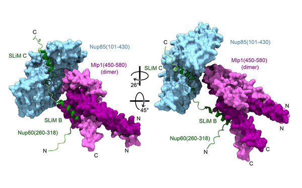The nuclear pore basket is a conical, net-like structure that is attached to the main body of the nuclear pore complex. The basket has numerous functions in nucleocytoplasmic transport and gene expression. Moreover, when huge cargo is transported through the pore, the basket can expand and then contract again, suggesting a great degree of structural plasticity. Scientists have long tried to understand how the nuclear basket can achieve this, but its biochemical fragility prohibited a reconstitution from purified components . We have now managed to reconstitute key parts of the basket on synthetic membranes. (Cibulka, et. al., Science Advances). Our study reveals an intricate assembly principle, characterized by a flexible 'suspension cable’ that ties the basket together, and opens avenues to reconstitute the early stages of nuclear pore biogenesis.