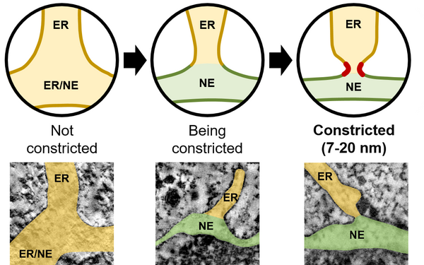 Using correlative live imaging with high resolution electron microscopy, we revealed that ER-nucleus junctions form narrow hourglass-shaped structures (~15 nm in diameter) which are distinct from the junctions within the ER, and that the junctions start to become specialized in early telophase. This observation strongly suggests that a novel mechanism, distinct from that known to remodel the ER, likely regulates ER-nucleus junctions, and lays the groundwork for many exciting future mechanistic and functional studies, shedding light on gene expression, nuclear organisation, and disease mechanisms.