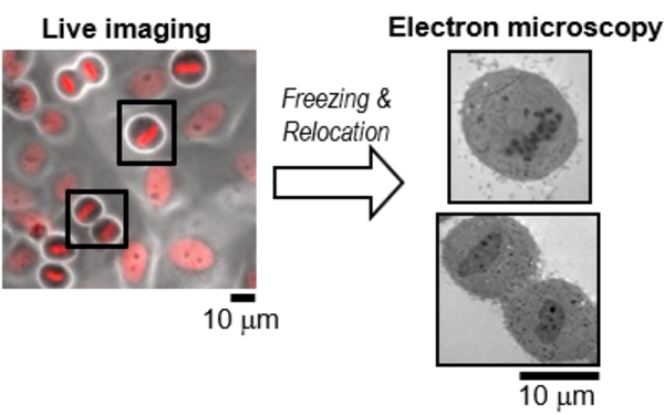 A correlative live imaging with electron microscopy was established that allows to examine subcellular structures and protein complexes at nano-meter resolution at specific stages of cell-cycle in a quantitative manner, and therefore can enable to visualize biological processes which have not been able to study due to the limited resolution of conventional microscopy.