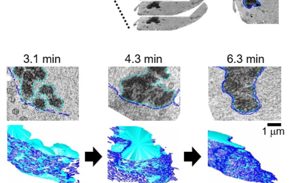 The correlative imaging technique was applied to study nuclear envelope (NE) assembly during mitotic exit, and could demonstrate for the first time that the NE forms from highly fenestrated ER sheet whose holes progressively shrink. This finding provides a new approach to explore the ER-NE connectivity and ask how it is regulated to ensure proper ER-nucleus communication.