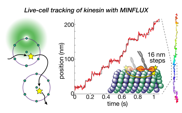 We developed MINFLUX tracking in 2D and 3D to study the 16 nm steps of the motor protein kinesin while it walks on microtubules in living cells. This is a first step towards monitoring functional conformational changes of protein machines at high spatiotemporal resolution in living systems (Deguchi et al., Science, 2023 - free full PDF version).