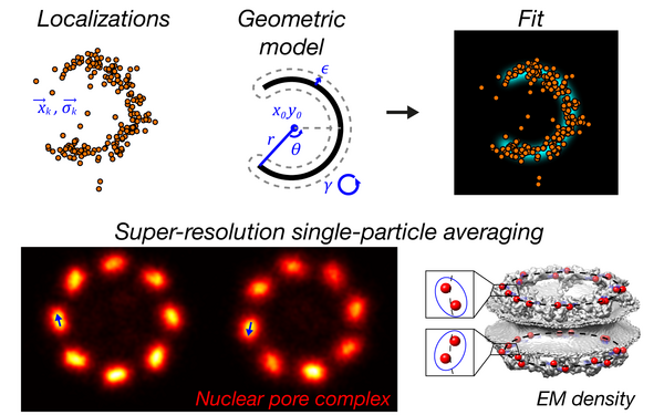 How can we analyze huge super-resolution data sets in a meaningful way? We developed LocMoFit, a tool that enables fitting of super-resolution microscopy data to an arbitrary geometric model. The fit extracts quantitative parameters of individual cellular structures, which can be used to investigate dynamic and heterogenous protein assemblies and to create average protein distribution maps (Wu et al., Nature Methods, 2023).