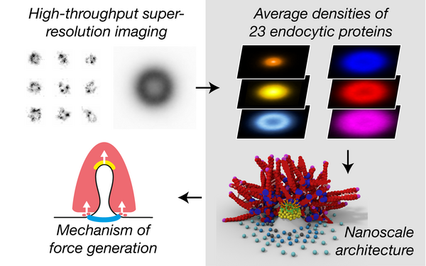 We developed high-throughput super-resolution microscopy and measured the nanoscale distribution of 23 endocytic proteins from >100 000 snapshots of endocytic structures in budding yeast, providing new insights into structure, assembly process, and force generation of the endocytic machinery (Mund et al., Cell, 2018).