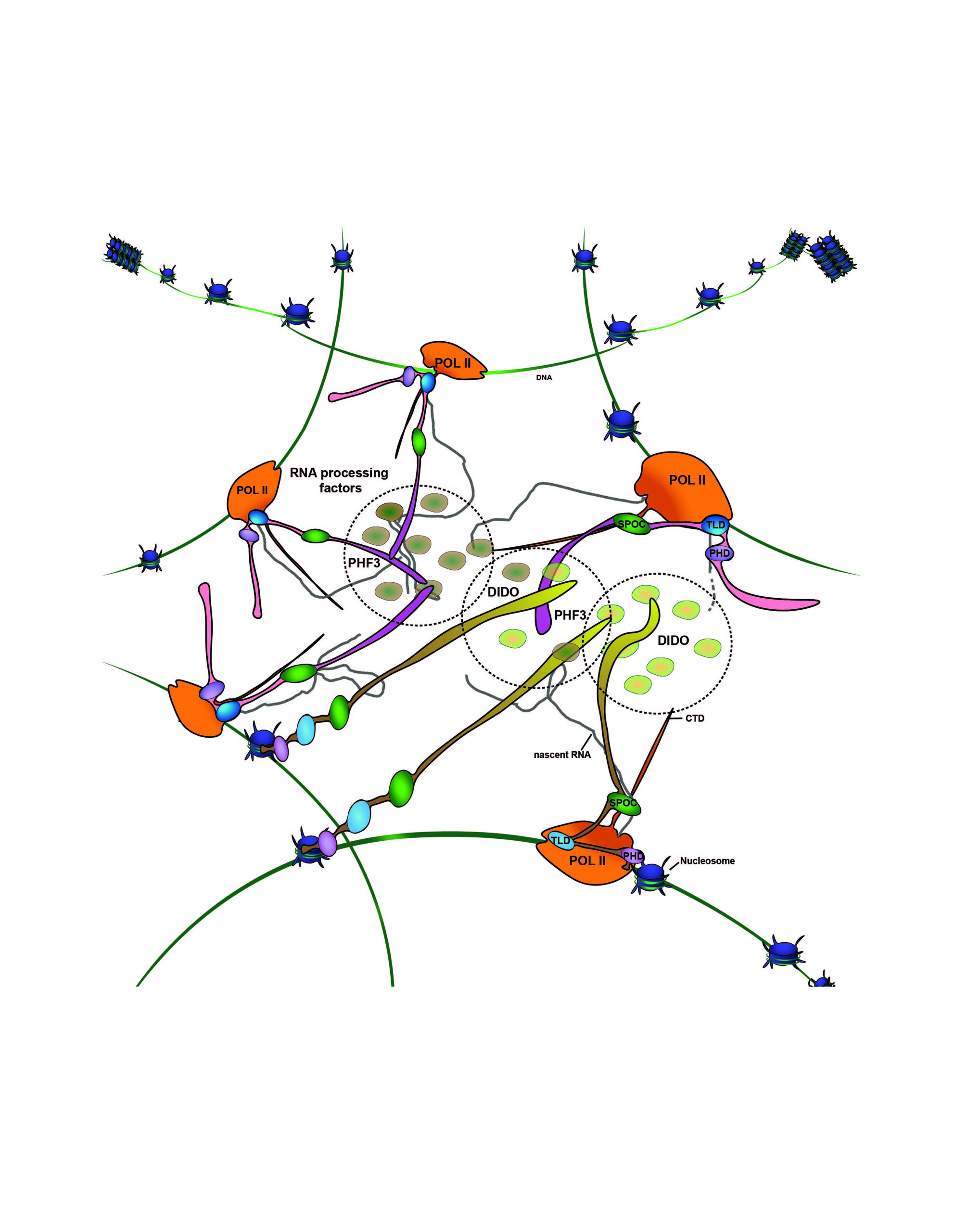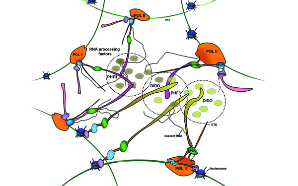 PHF3 and DIDO3 paralogues co-regulate transcription by bridging the Pol II elongation machinery with chromatin and RNA processing factors and tethering Pol II in a phase-separated microenvironment. In the absence of PHF3, the DIDO long isoform DIDO3, which contains the SPOC domain, is upregulated to compensate for PHF3 loss as an example of paralogue buffering through isoform switching.