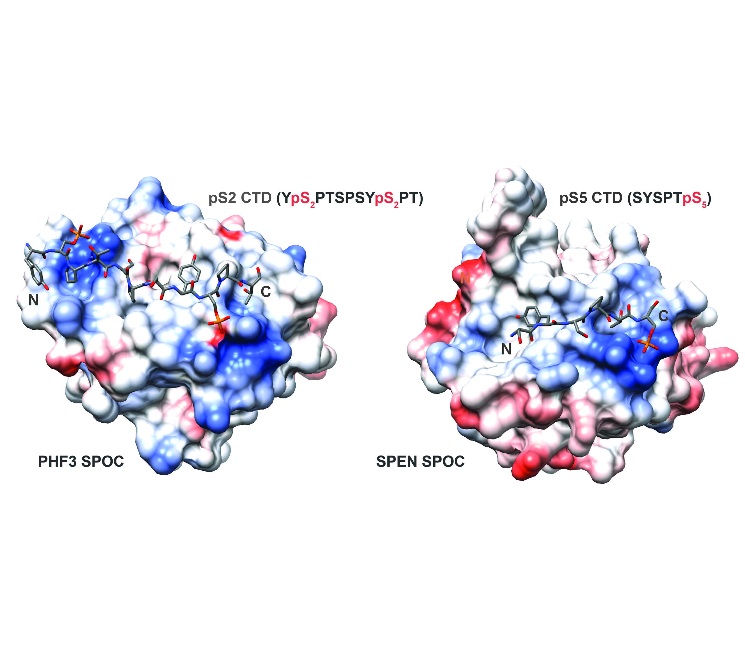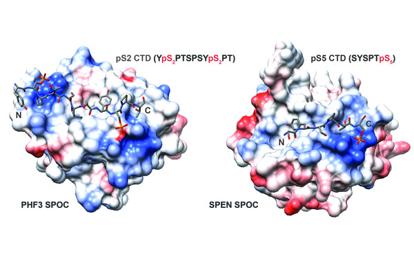SPOC domains of PHF3, DIDO, RBM15 and SPEN (SHARP) display different affinities and specificities for Pol II CTD phosphomarks. PHF3 and DIDO SPOC specifically recognize tandem pS2, whereas SPEN and RBM15 SPOC preferentially bind pS5. PHF3 and DIDO SPOC primarily mediate interactions with Pol II and the transcription elongation machinery, while RBM15 and SPEN SPOC bind writers and readers of m6A.